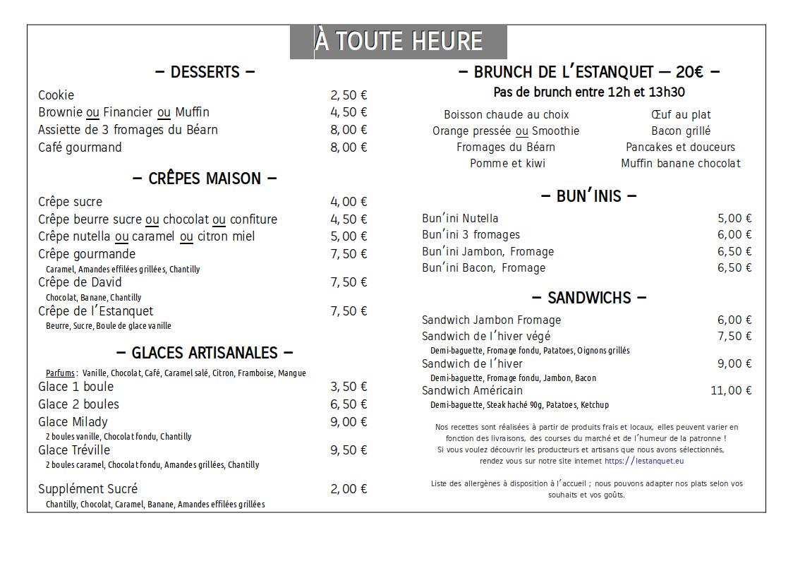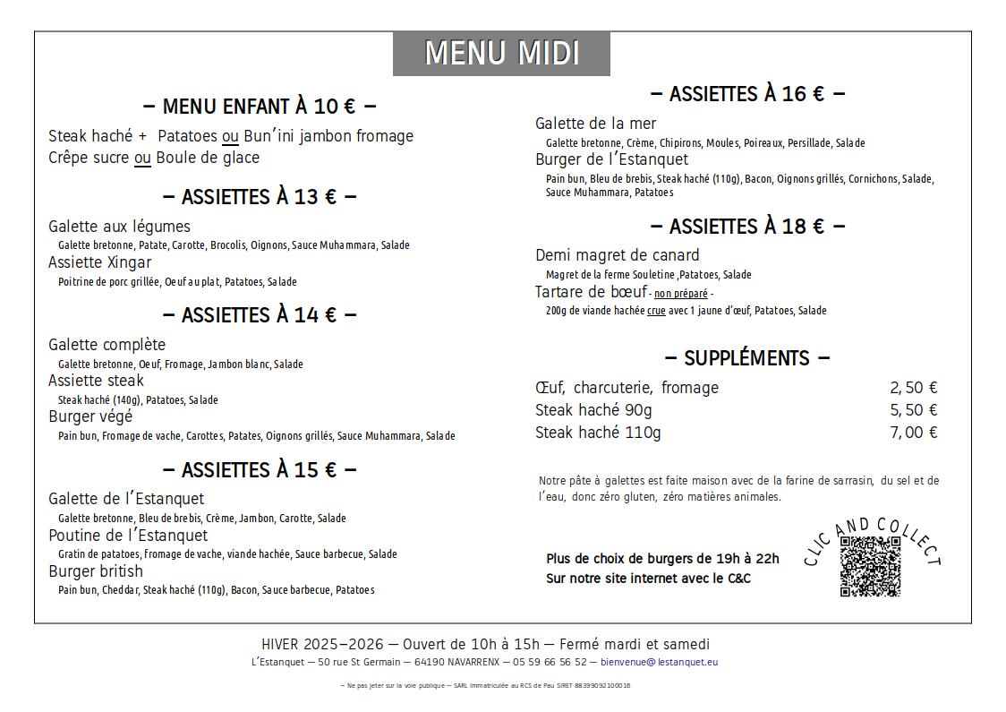 MENU HIVER 2025-2026 Retour des galettes ! En grande nouveauté le brunch ! Venez vous régaler sur place le midi / Et le soir commandes en ligne !